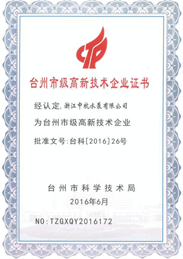 我們堅信"科學(xué)技術(shù)是第一生產(chǎn)力",不斷提高產(chǎn)品的技術(shù)水平和科技含量,先后獲得數(shù)十項發(fā)明專利和實用新型專利,2016年獲批臺州市級高新技術(shù)企業(yè),2017年同時獲批省級和國家級高新技術(shù)企業(yè),2018年獲批"臺州市級企業(yè)技術(shù)中心",2019年獲評臺州市"瞪羚企業(yè)"和"溫嶺市百強(qiáng)企業(yè)",并當(dāng)選為"溫嶺市泵與電機(jī)標(biāo)準(zhǔn)化技術(shù)委員會"首屆委員單位,發(fā)展后勁不斷增強(qiáng)。