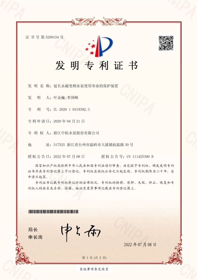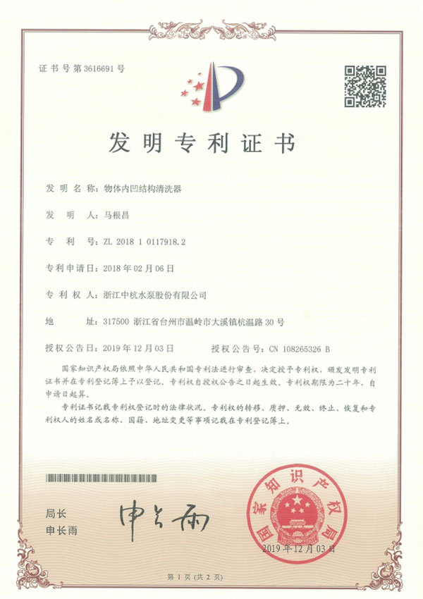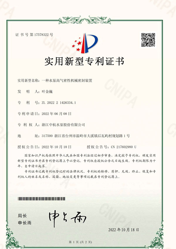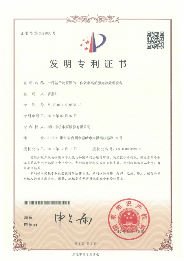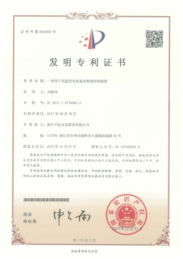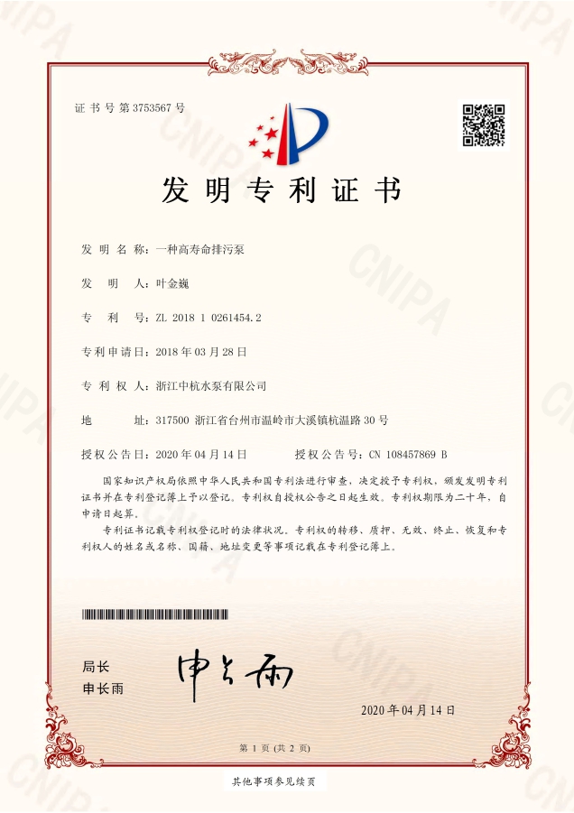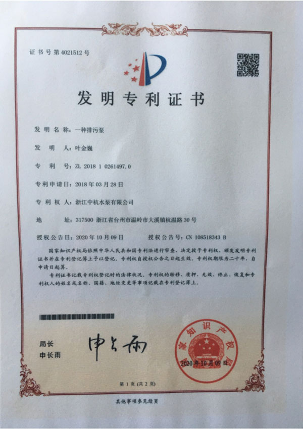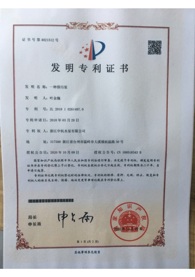 中杭水泵 資質(zhì)與專利