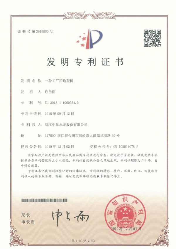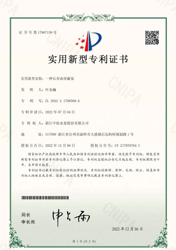 中杭水泵 資質(zhì)與專利